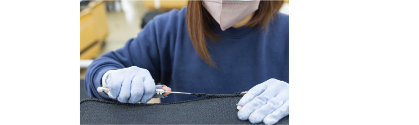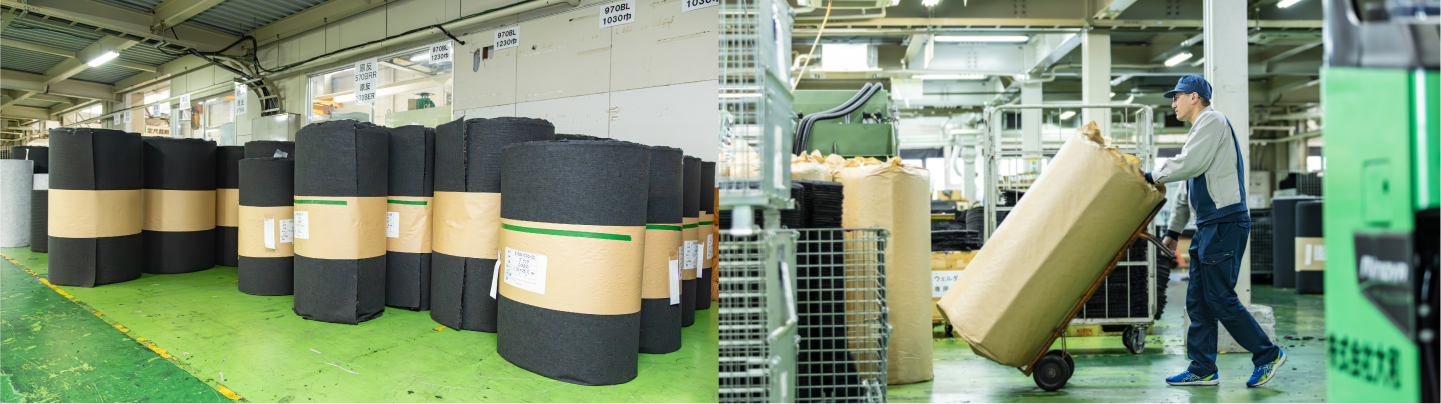 自動車メーカーから指示された規格・色・毛足・密度に基づいて各地の原反メーカーに生産してもらった原反を受け入れます。